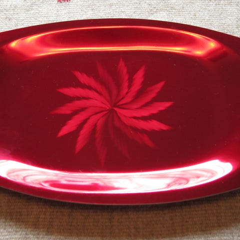 Tøft vintage fat i rød emalje fra Emalox Made in Norway. Vakker emaljeblomst i midten. Måler 37*18,5cm og 1,5cm høy. Ørsmå bruksmerker, ref alder. Klar for nye kaker og godterier! Hentes på Torshov. Heis.