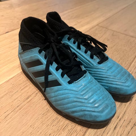 Adidas fotballsko for barn, unisex, størrelse 34, i blå farge. Skoene har knotter på sålen for bedre grep på gressbaner og er laget i pustende materiale for komfort under bruk.