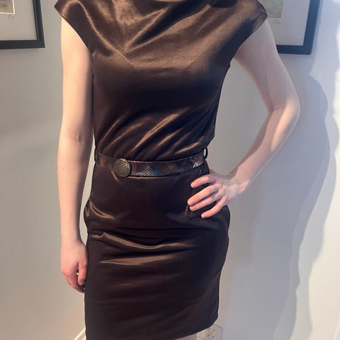 Nydelig kjole fra Mango Suit. Lite, men pent brukt. Passer XS-S. Jeg er 168cm høy. Flatterende på. Grå I fargen, liten splitt bak, skjult glidelås i ryggen.