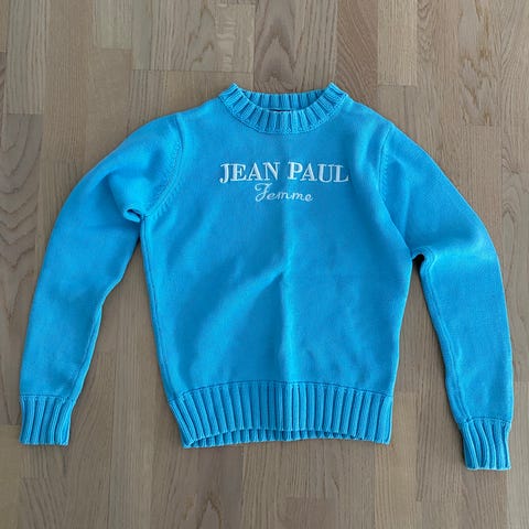 Brukt marineblå genser fra Jean Paul Femme i størrelse S selges. Genseren er laget av 100 % bomull og er i relativt god stand.