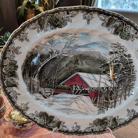 Nydelig nostalgisk mønsteret - tidløs Friendly Village The Ice house redesignet etasjefat, deler av Johnson Bros og blanding med Porsgrund porselen tallerken 17 cm på bunnen.