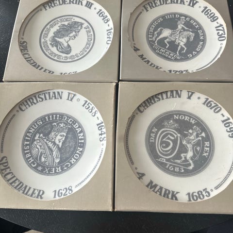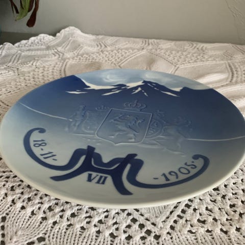 Tallerken fra Porsgrund porselen med tekst Mit land hav tak, du skjænkte mig det bedtste. Replika av skjoldet som ble gitt kong Olav i 1975 i anledning 150 års jubileum for immigrasjon til USA.