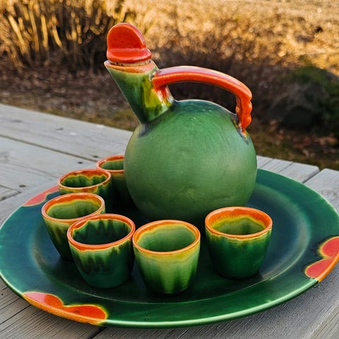 Eldre kaffeservise fra Egersund, tilsammen 40 deler, sort og grønn dekor. Det lille askebegeret/skåla har det lille urnestempelet, et par av delene med modell evt dekornummer, ellers ingen øvrig merking. Veier tilsammen rundt 7kg. Ingen krakelering og de aller fleste delene er i fin stand, noe loppebitt/avslag på randen - skavanker er veldokumentert ved bilder bakover i annonsen.