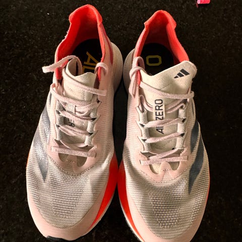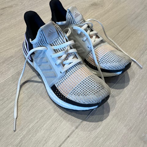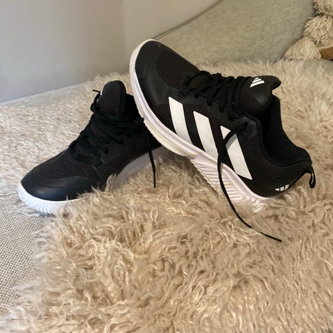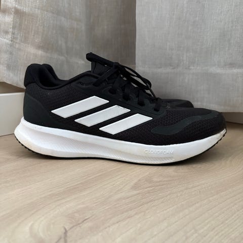 Adidas Falcon løpesko i størrelse 40. Skoene har en kombinasjon av hvit og beige farge med blå detaljer på hælen. Materialet består av mesh og syntetiske materialer som gir god pusteevne og komfort. Sålene er svarte med hvite innslag og har god demping. Egnet for både trening og hverdagsbruk.