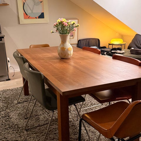 Stort fint spisebord fra Møblia med én ekstra innleggsplate. Kan få plass til 14 personer.
