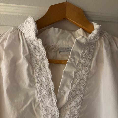 # bluse - silke - skjorte - lang arm - blonde - skjellknapp - detaljer