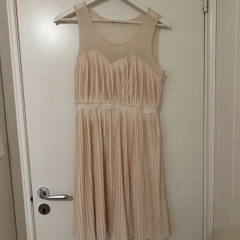 Kort / halvkort kjole i dus rosa med plissestoff på skjørtet og rosa mesh øverst og på stroppene. En delikat kjole som kan pyntes opp og ned. Strikk i båndet rundt livet gjør at den sitter fint på flere størrelser. Skjørtet legger seg fint.