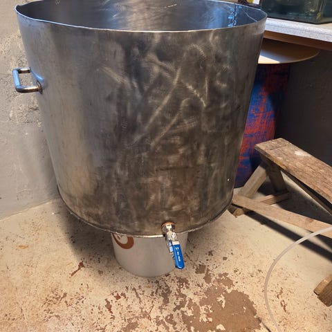 5 gjæringskar. Det ene lekker.