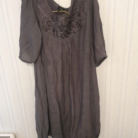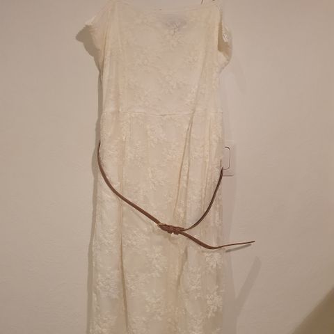 Kjolen er hvit, lag-på-lag, og med forskjellig mønster på forside og bakside. Avtagbart belte.