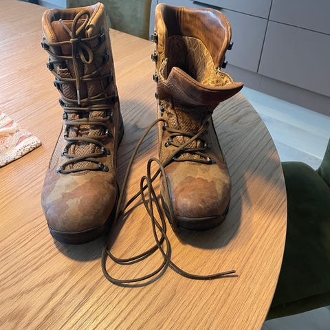 Nær ubrukte (brukt en gang i fem minutter), da disse viste seg å være litt for smale og litt for små til mine breiflabber. Størrelse 44 (42-43 med og uten ullsokker funker nok fint).