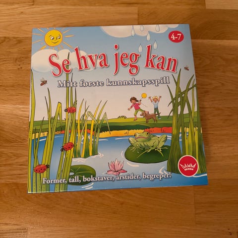 Se hva jeg kan: I dette spillet lærer barna om begreper, språk, tall, mengde, ukedager og mye mer på en morsom måte. Spillet er ment for barn som ikke har begynt på skole enda, og forbereder barnet til skolen. Nypris 340 kr - selges brukt
