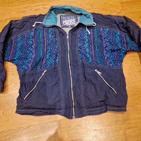 Fin, retro fritids jakke med hette selges. Den er foret med matchende burgunder farget for. Jakken har mange fine detaljer som to skrå lommer foran, en innerlomme i foret, og en skjult lomme i høyre erme. Lommen i ermet åpnes /lukkes med et skjult glidelås. Fram på ermet er det et hull for tommel.