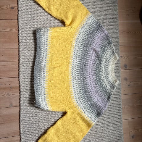 Off shoulder strikket genser, str L, selges Kr 500,-kjøper betaler frakt. Strikket i 65% Alpakka, 28% Polyamid, 7% Ull, Drops Air.