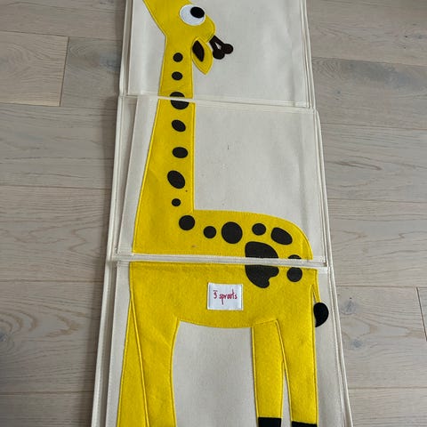 Fire store med gul søm, tre store med rosa søm og en liten med gul søm. Siste bildet viser dem når de er brettet og tatt i bruk.