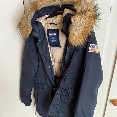 Min datter har vokst fra yndlingsjakken som tåler både snø, regn og ruskevær og har den mykeste pels i hetten. Meget praktisk vinterjakke fra Svea i modell «Québec» i str S, farge navy.