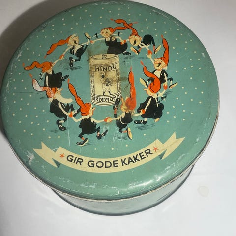 Nostalgisk metallboks fra Lorentz Erbe & Søn. De tusen hjem’s dessert. Litt bruksmerker , se bilder.kan sendes for 69kr