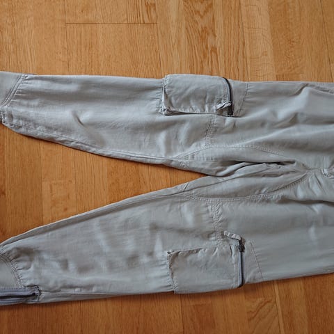 Sand bukse W27, lengde 92 cm, brungrønn, nesten over i en svak militærfarge. Noen løse tråder, se bilde, ellers kjempefin.