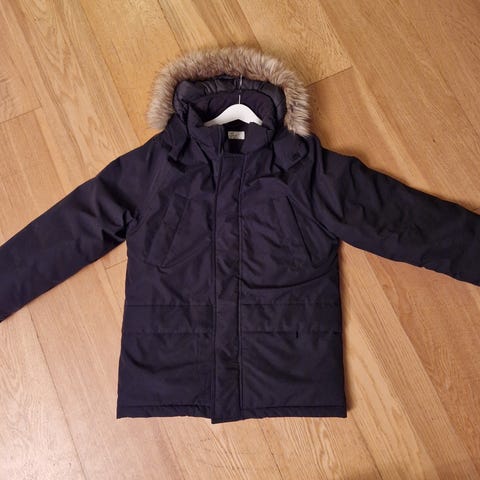 God og varm vinterparkas i størrelse 128 selges. Med fuskepels langs hetta og fleecefor i kragen. Refleksstriper.