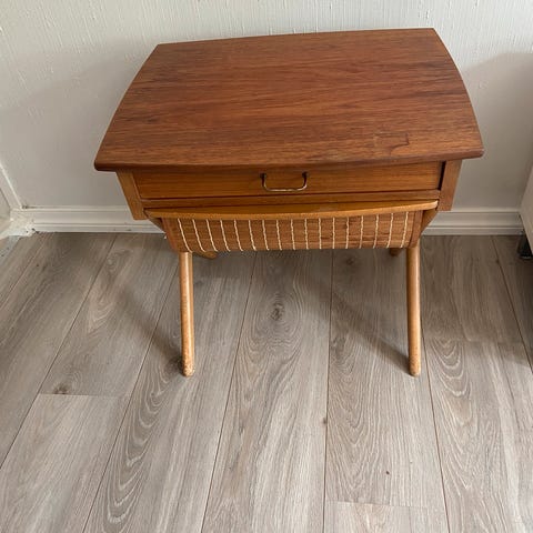 Lekkert 60-talls sybord, muligens formgitt av Bendt Winge, ingen merking, antar norsk eller dansk. Heltre teak understell, teakfinèr på bordplata og kunstskinn. Bordplata skyves bakover og vippes opp for å få tilgang til den praktiske plastinnsatsen under, samt romslig skuff i brunt kunstskinn til nøster etc.. Måler 56x55cm, høyde 47cm. Har godt av en ny stain på bordplata om man skal pirke, inne særlig sjenerende i innelys, ellers fin stand, se bilder.
