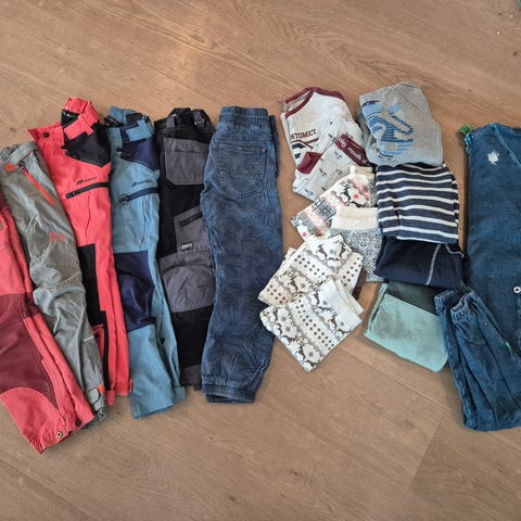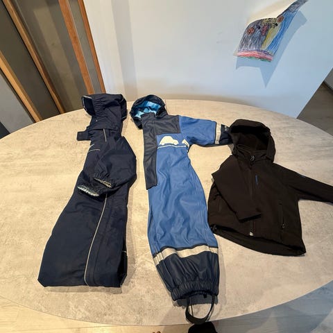 3 utebukser, 1 anorakk, 1 allværsjakke.