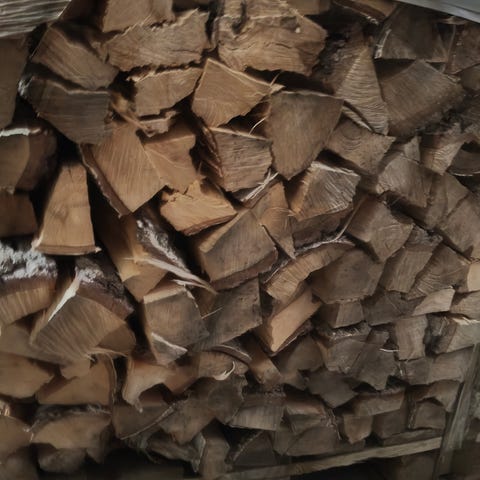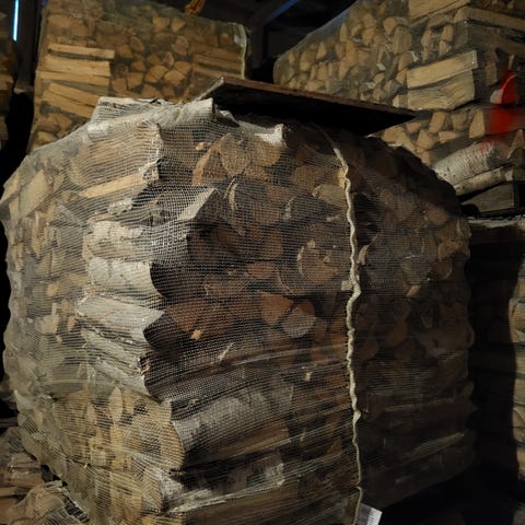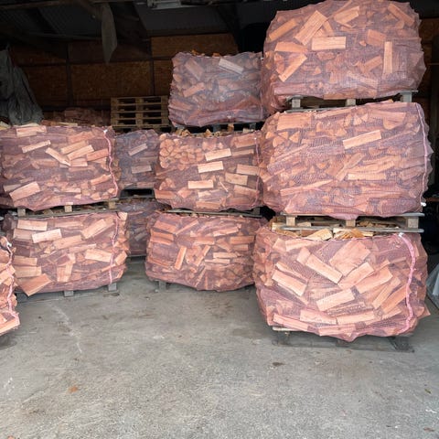 Vi selger ved i godt fyllte 1500 liter sekker, kappet og klyvd i vinter, tørket og lagret under tak.