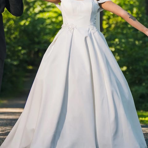 Jeg har en sateng brudekjole å selge. Det er det mest fasjonable enkle designet, håndlaget av en designer. har ingen tegn til bruk.