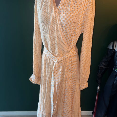 Usedvanlig vakker og velholdt kjole. Den ser ny ut. Roper gammel sort-hvit-film lang vei. Kan knyttes både foran og bak slik jeg demonstrerer på bildene.