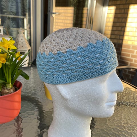 Heklet sort lue med blå kant