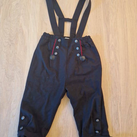 Mørk blå foret cordbukse med brune seler. Lite brukt. Str 98. HM. Foret er grått.