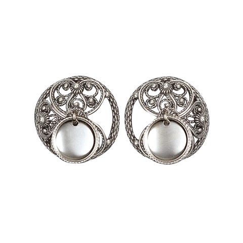 SAGA-sølv-anheng kjede – oksydert-“med 2 berlocker”- Et meget raffinert hengesmykke i filigransteknikk fra eldre jernalder – ca. 300 e. Kr. Lignende hengesmykke er funnet ved Fevang i Vestfold.