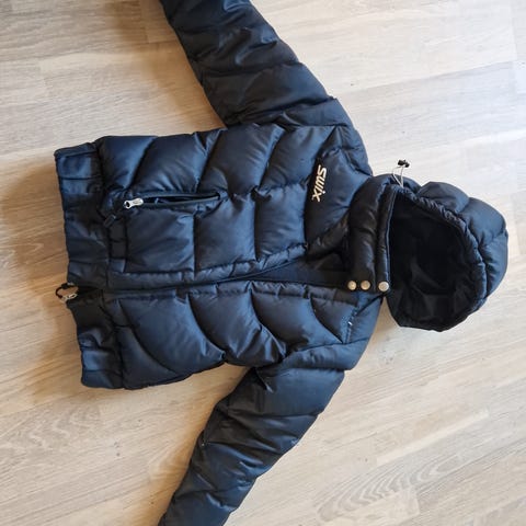 Varm Swix dun jakke til jente. Pent brukt. Fyll dun/fjær 70/30. Gode lommer med fleece på innside samt fleece på krage. 1 innerlomme med glidelås. Snøring nederst på jakke. Gode strikk nederst på ermer og på hette.