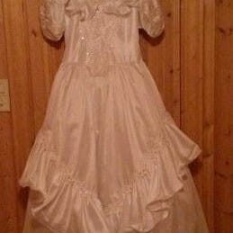Brudekjolen ble brukt av meg, som er 167 cm høy og jeg brukte 1 cm høye sko. Kjolen har blitt sydd opp i skuldrene, og det er lagt opp til at man skal kunne sprette det opp igjen, for å få kjolen et par centimeter lengre.