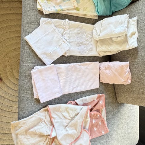 4 stk sengelakene str 80x40 cm fra Princess, 1 stk sengelaken fra Ikea og 1 stk tisselaken til bedside crib selges!
