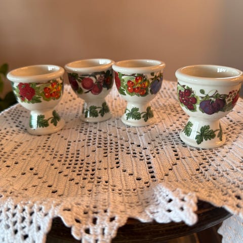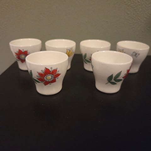 6 stk veldig gamle eggeglass fra Royal Copenhagen Alumenia dekor Solbrud. Blanke og fine selges kr 300 samlet + evt frakt. Se også mine andre annonser ved å klikke på navnet mitt.