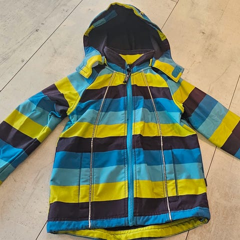 Denne er pent brukt og tåler masse, men har fått en liten slitasje på den ene lommen, se bilde. Avtakbar hette. Oppleves som god slitesterk skalljakke.