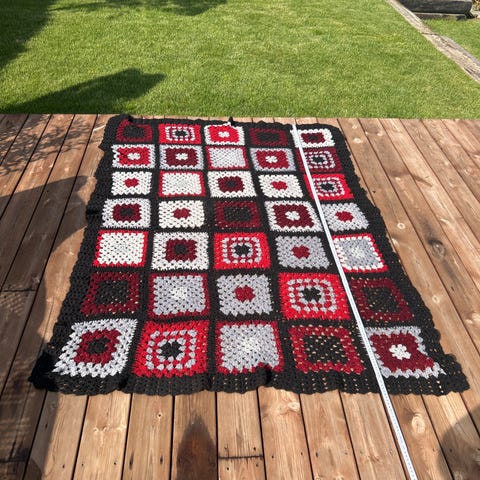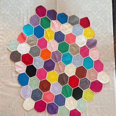 Håndlaget heklet teppe med et flerfarget design laget av ull. Teppe har et klassisk rutemønster med en sort bakgrunn som fremhever de fargerike detaljene. Passer godt som et dekorativt element eller for ekstra varme i hjemmet.