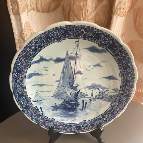 Håndmalt porselensplatte fra Delft Blauw. Motiv:vindmølle i Holland