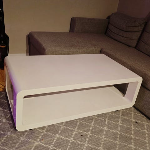 Vårt kule sofabord «Balance» fra House Doctor selges. Det har noen bruksmerker, men fremstår som fint. Vil tro bordplaten også kan sprayes på nytt.