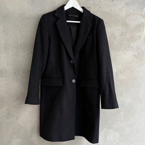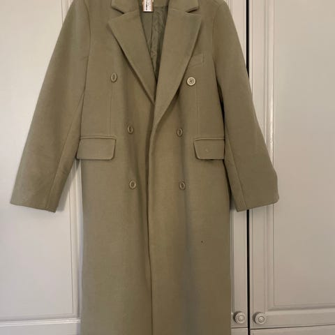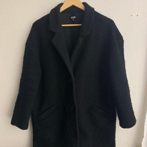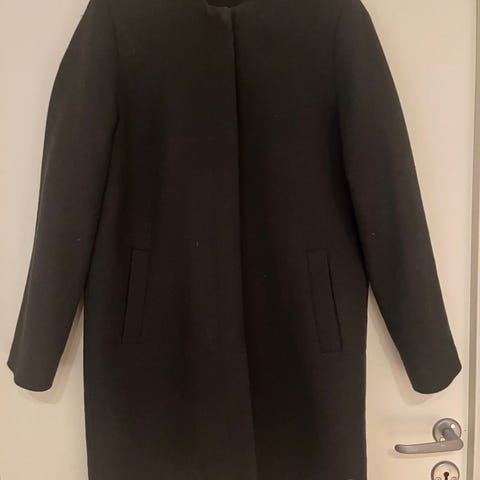 Fin rød og svart vevd ullblanding kåpe fra ASOS, med skinnimitasjon ermer. Str 40. Som ny, brukt bare et par ganger.