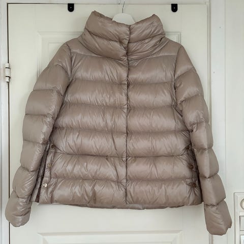 Tynn boblejakke med trykknapper i front og siderommene med glidelås. Vidde ved armhulen ca 50cm, livvidde ca 47cm. Pent brukt, ypperlig overgangsjakke.