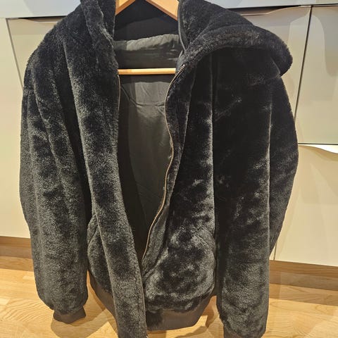 Svært lite, og pent brukt, JDY bomber-jakke i str Large selges kr 150,-. Nypris kr 499,-. Svart med sølvfarget glidelås, 2 stikklommer, vide ermer med strikk nederst.