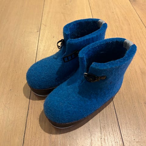 Pent og relativt lite brukte ulltøfler fra Tova selges. Tror det er en spesialutgave knyttet til Jul i Blåfjell. Pen blå farge med litt lysere blå inni.