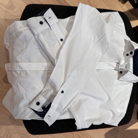 Pent brukt skjorte, og det er ikke skader i stoffet. Mangler ingen knapper, og alle knappene er identiske. Mangler lapp og størrelse, men mener det tilsvarer en large/x-large. Er ulike varianter av fargen lys, dunlilla, men synes ikke det kommer helt godt fram på bildene