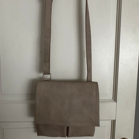 Veske i beige. 3 rom med glidelås. Magnetlås. Avtagbar skulder reim, og avtagbar håndtak med sølv detaljer på den ene siden. str 26x18.
