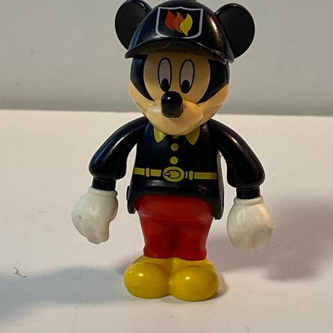 Den er i solid plastikk og i god stand. Den ene armen beveger seg ved å snu på den.