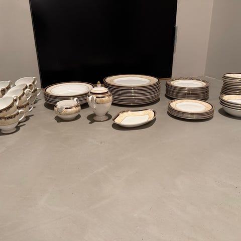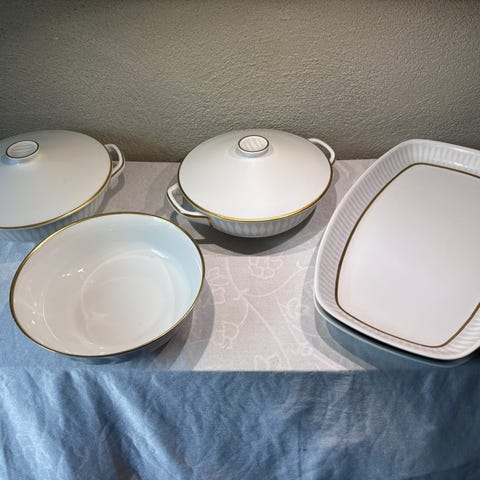 Gammelt servise fra 60 tallet med gulldekor. Middagstallerkner, suppetallerkener og asjetter til 7 personer. Boller, fat og suppeterrin. Selges samlet til hbo 1500