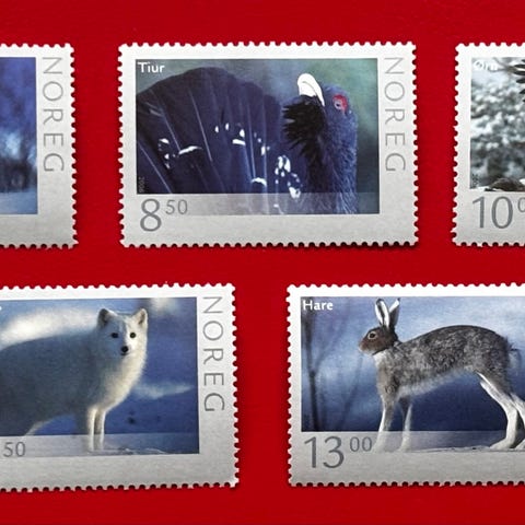 Vakker serie i 4-blokker med ville dyr i Norge. Pålydende = 194kr