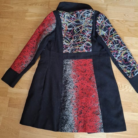 Kul jakke / cardigan fra betty barclay som kan snus og brukes på begge sidene. To i en. Svart, hvit og rød med knapper. Det er ingen lapper men tipper størrelse ca medium. Under arm til under arm ca 49cm, hele lengden 85cm :) Litt elastisk. Litt slitt på albuene. 🙃
