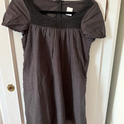 Kjolen er strikket i mørkblå farge, med en bommullskappe i grått og hvitt nede på kjolen.