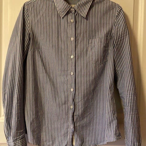 Stripete fersken og hvit skjorte.